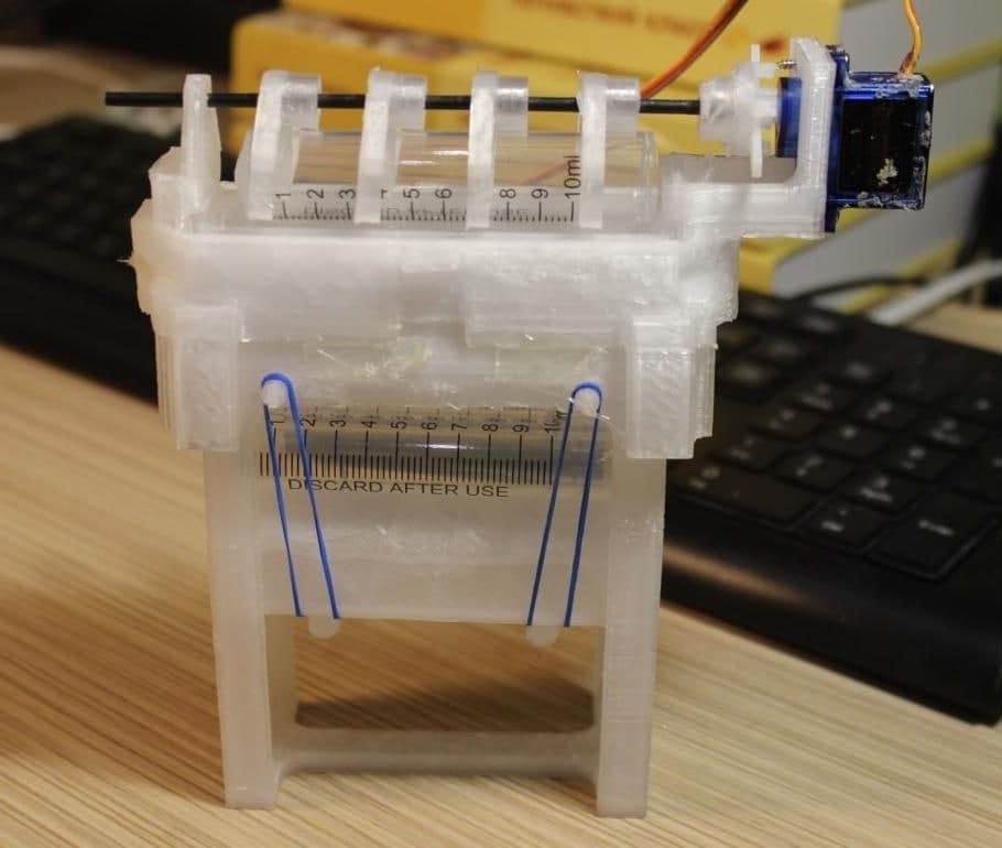 This device looks like a regular firearm mag, and functions exactly in the same way. Masks can be loaded into containers made out of 20ml syringe barrels.