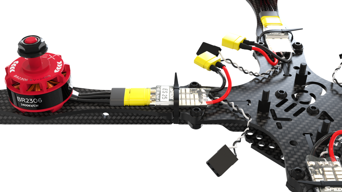 Connect the speed controllers (ESC) to the motors using the MR30 connectors and fasten them to the beams using clamps.