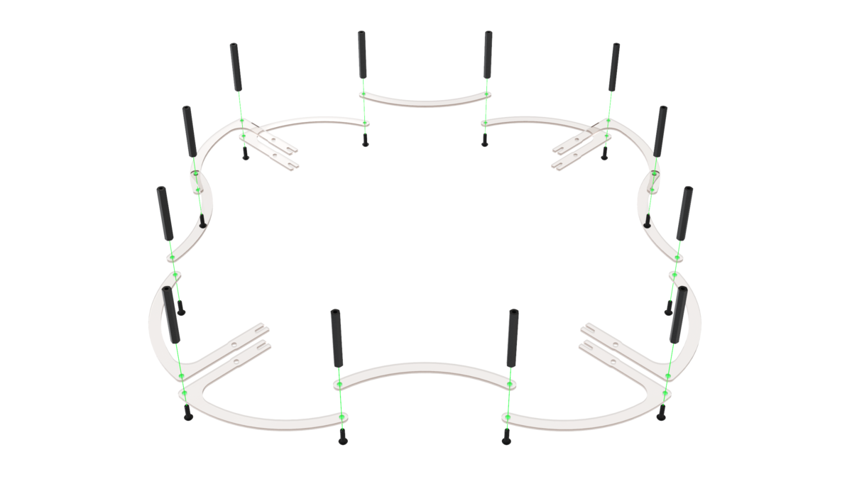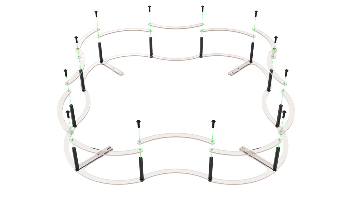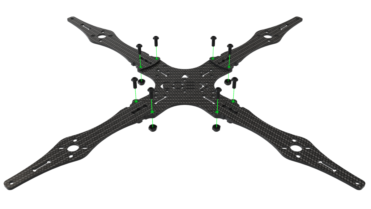 Align the 4 beams with the center deck, fix them with the M3x8 screws and nuts with a nylon insert.