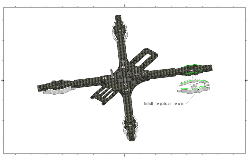 Align the 4 arms between the middle and bottom plates, installing the spacer between them.