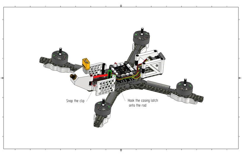 Install the rear protective guards by hooking them onto the standoff near the flight controller and snapping the clip onto the rear standoff.