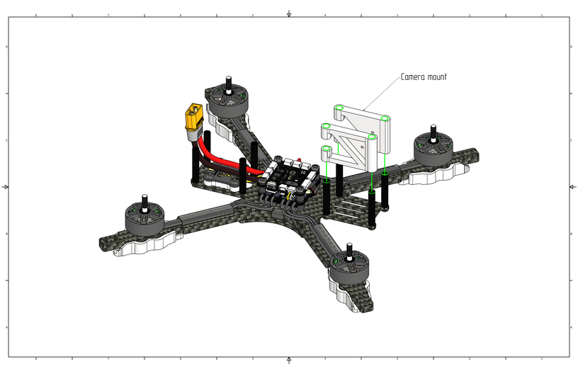 Install the video camera into the mount using M2x3 screws (Cell 20) and secure it at your preferred camera tilt angle.