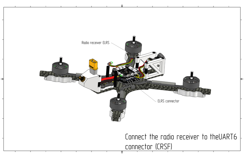 Install the ELRS radio receiver and connect it using the cable to the SBUS/CRSF port on the flight controller.