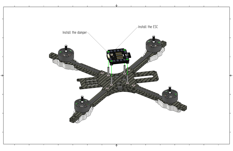 Install the Electronic Speed Controller (ESC) over the M3x40 screws (Cell 6) on the middle plate. The battery power contacts should face backward.