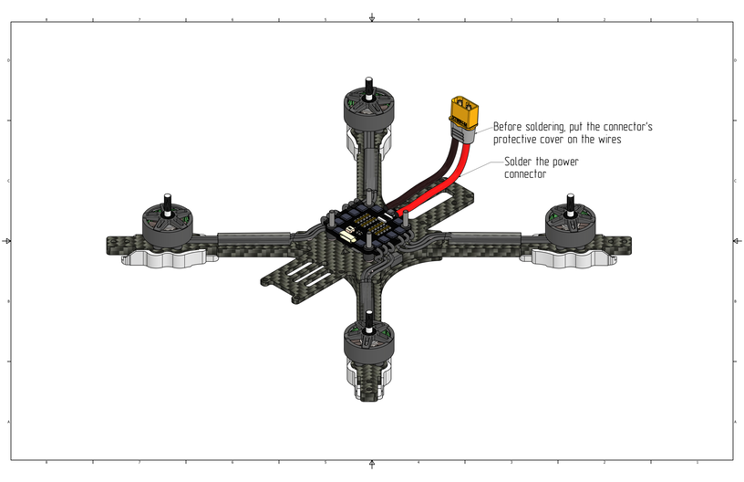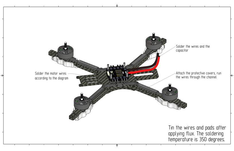 Glue the protective covers and thread the motor wires through them. Solder the power wires and the capacitor to the ESC power pads, and solder the motors to the motor pads (see image below).