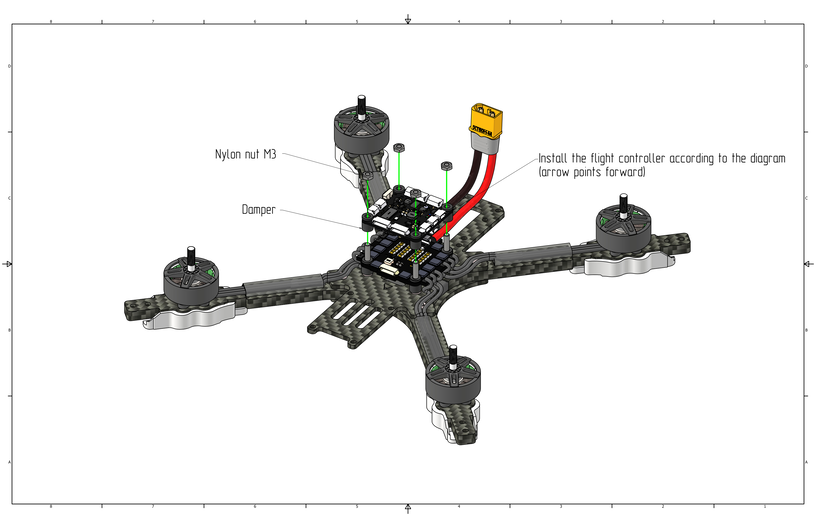 Install the flight controller with the arrow pointing forward, then install M3 nylon nuts (Cell 2) to secure the flight controller.