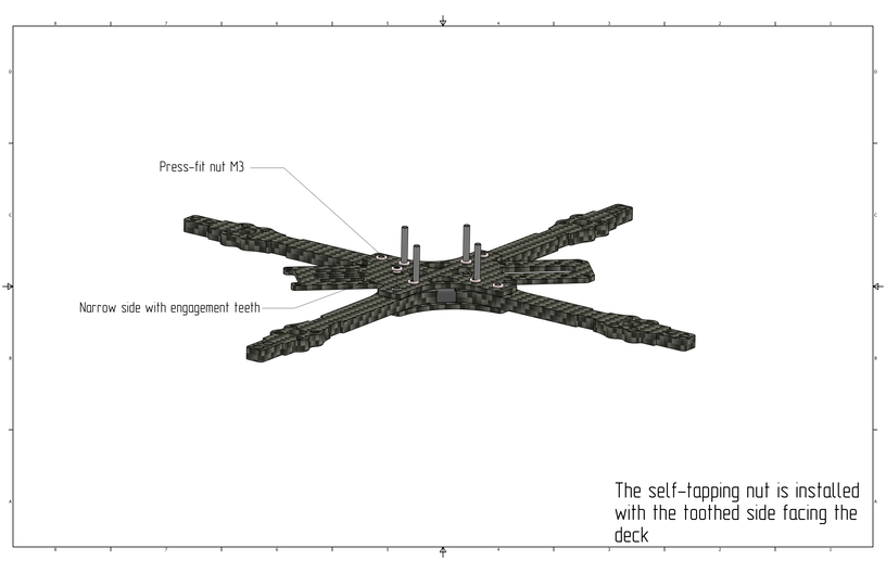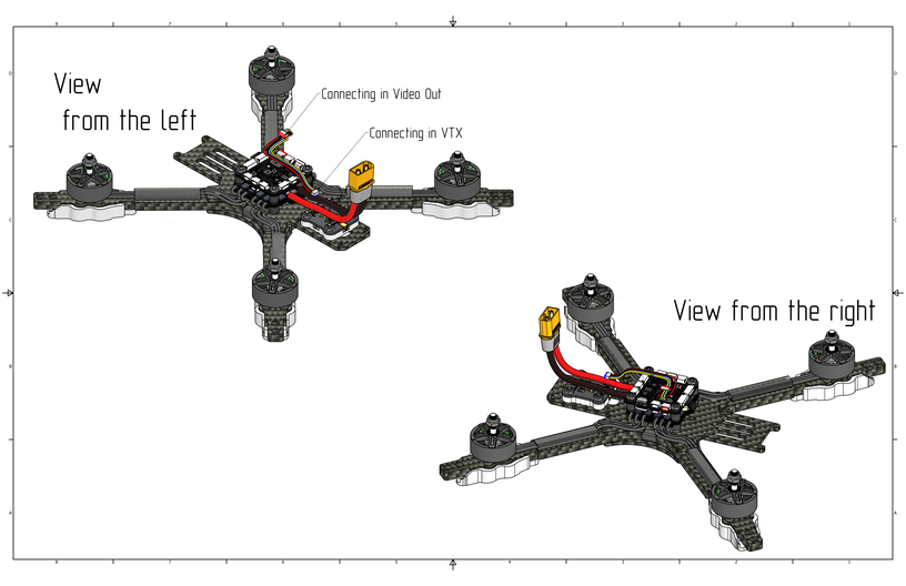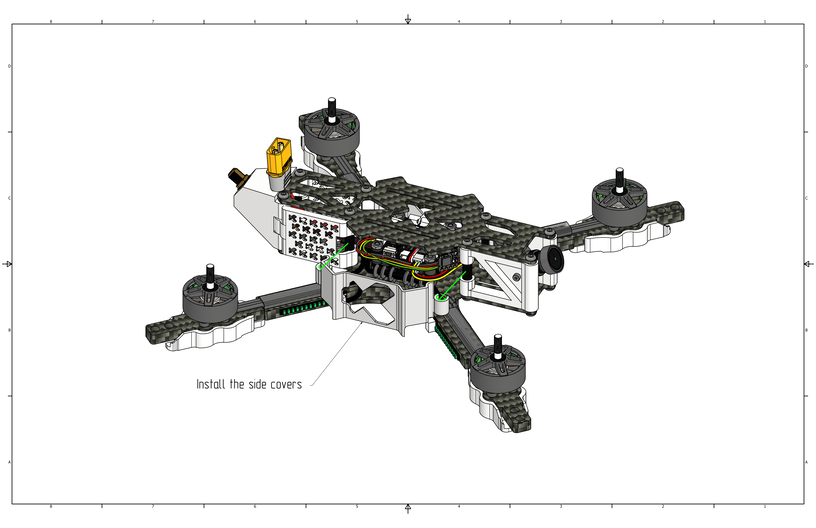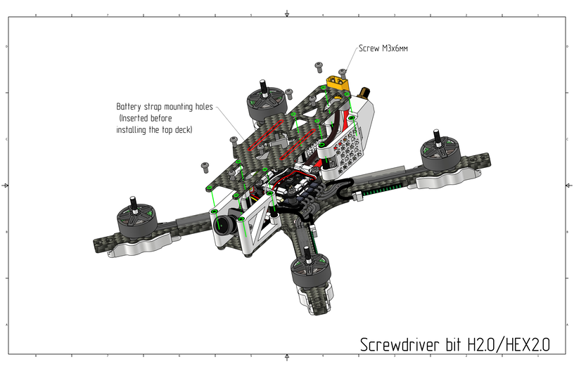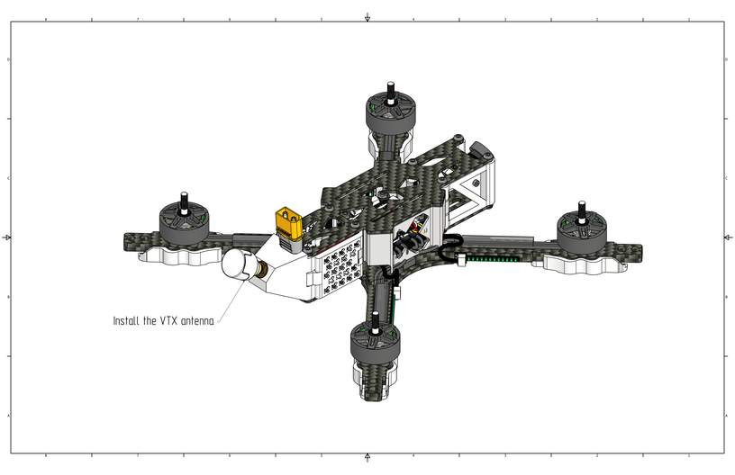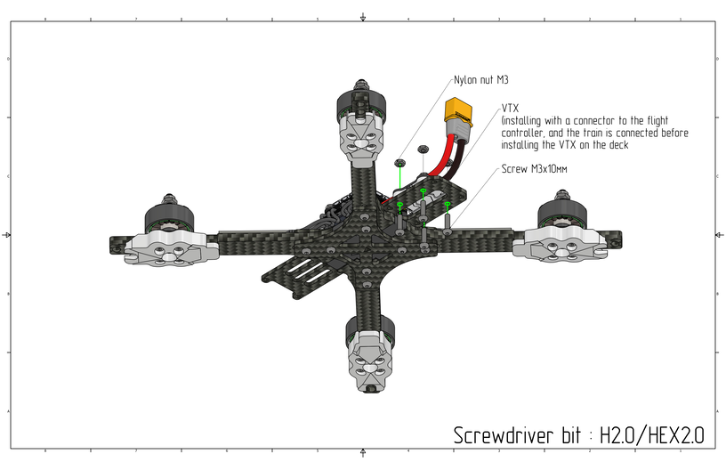 Install M3x10 screws (Cell 13) from the bottom side of the plate; from the top side, install the Video Transmitter (VTX) and secure it with M3 nylon nuts (Cell 2).