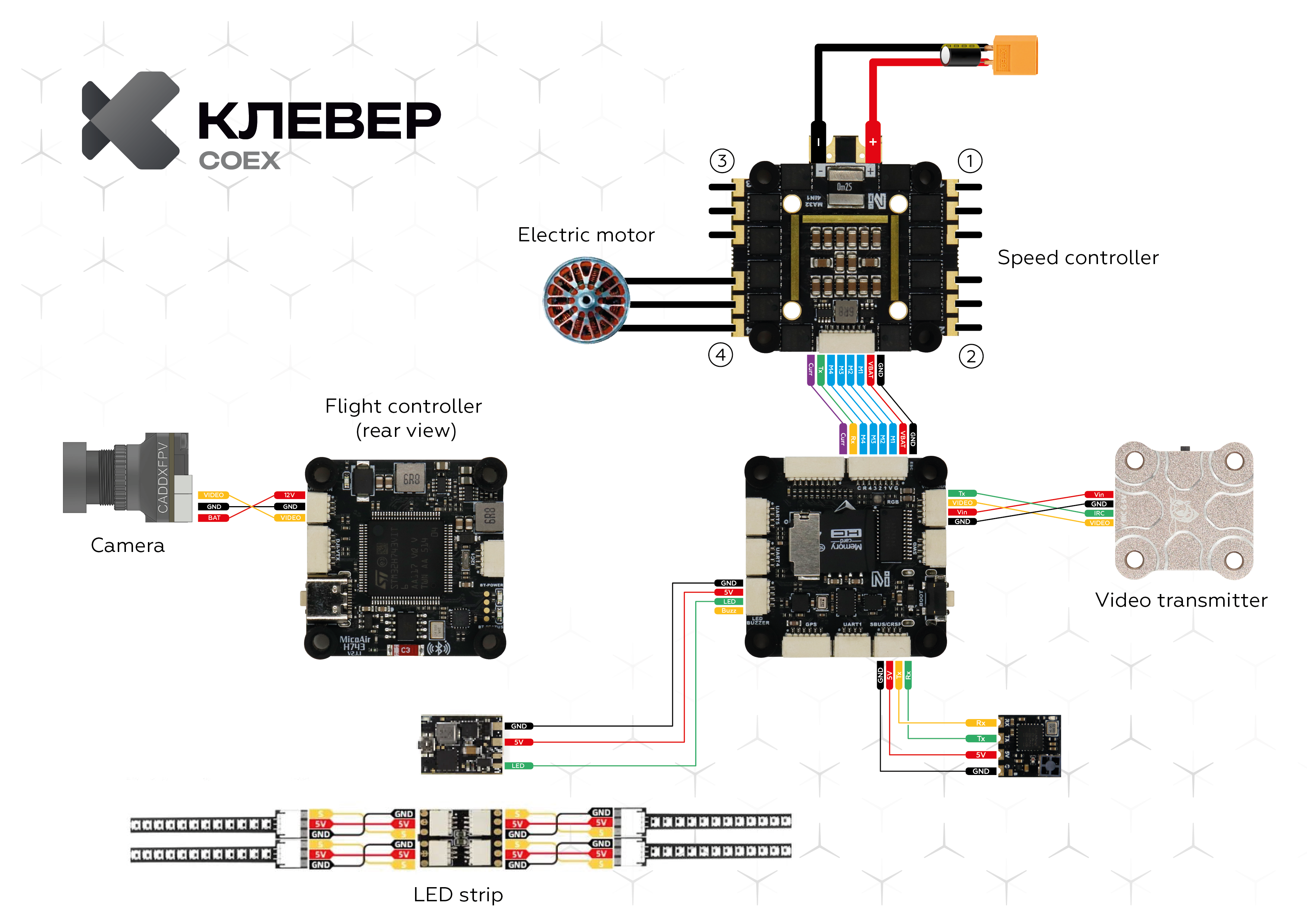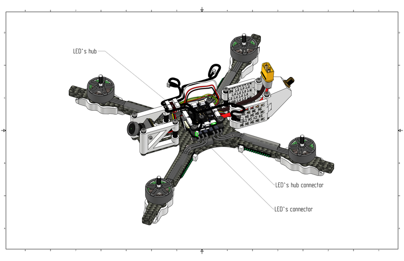 Connect the LED modules to the hub as shown in the image. Connect the hub to the LED/Buzzer port on the flight controller.