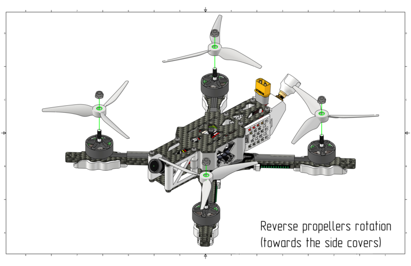 Install the propellers according to the reversed rotation direction ("props out"), as shown in the image.