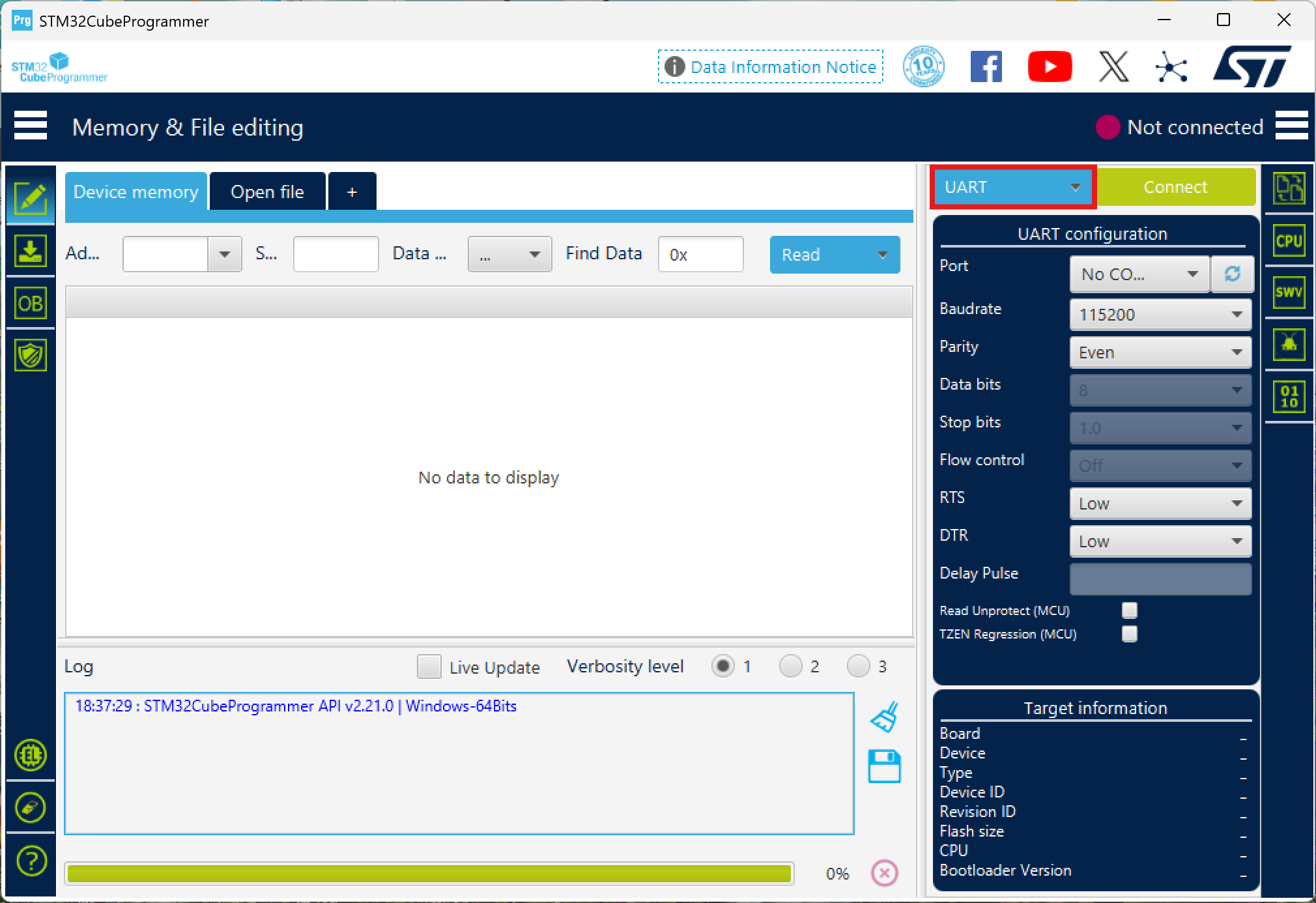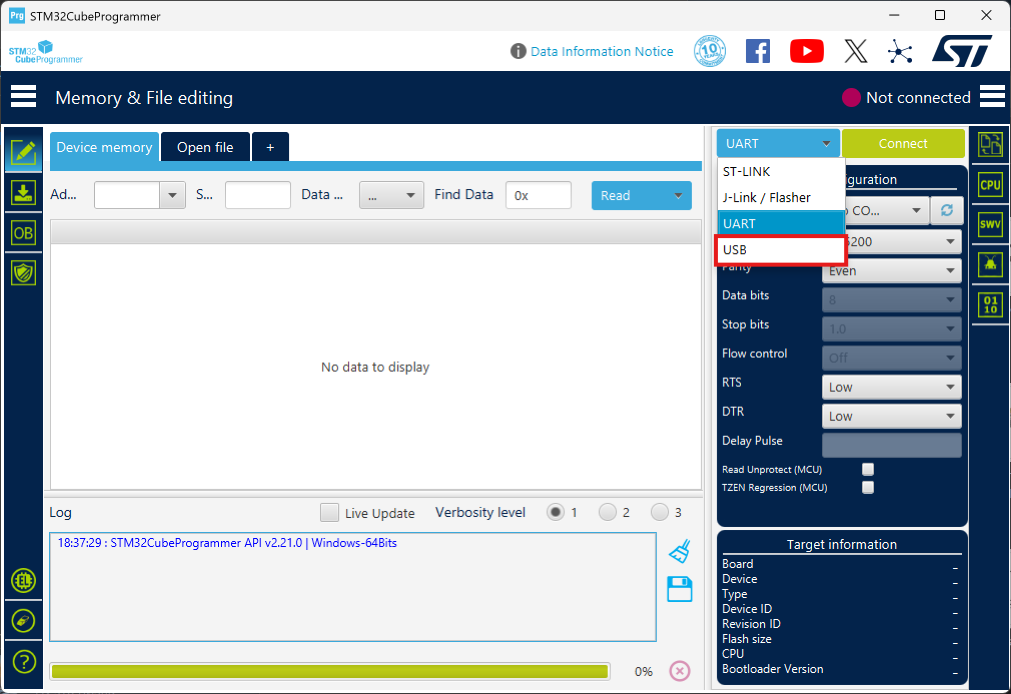 Put the flight controller into DFU (hold BOOT and plug it in via USB). Open STM32CubeProgrammer and click the connection protocol selector (UART).