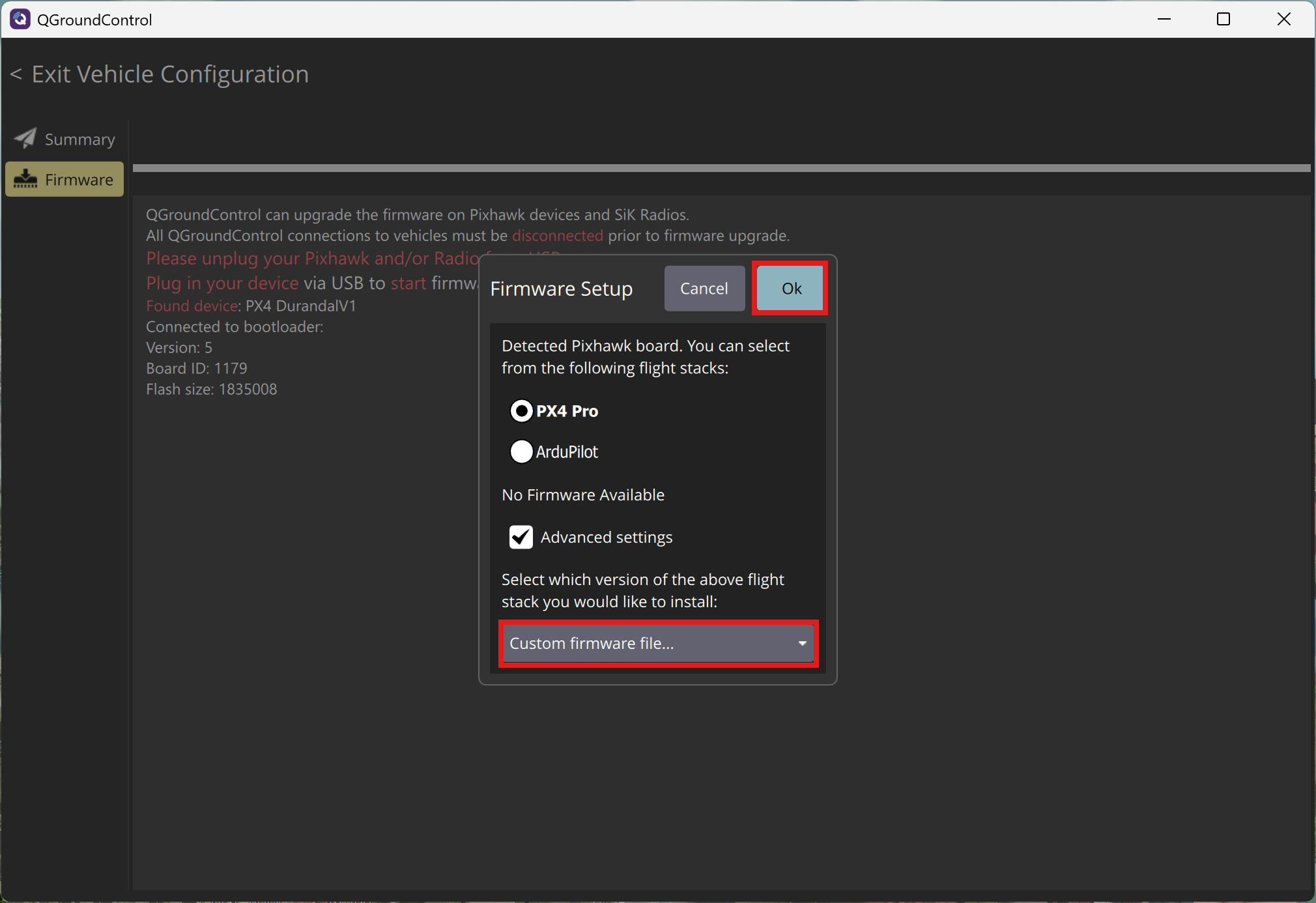 In the list at the bottom, select "Custom firmware file..." and click OK.