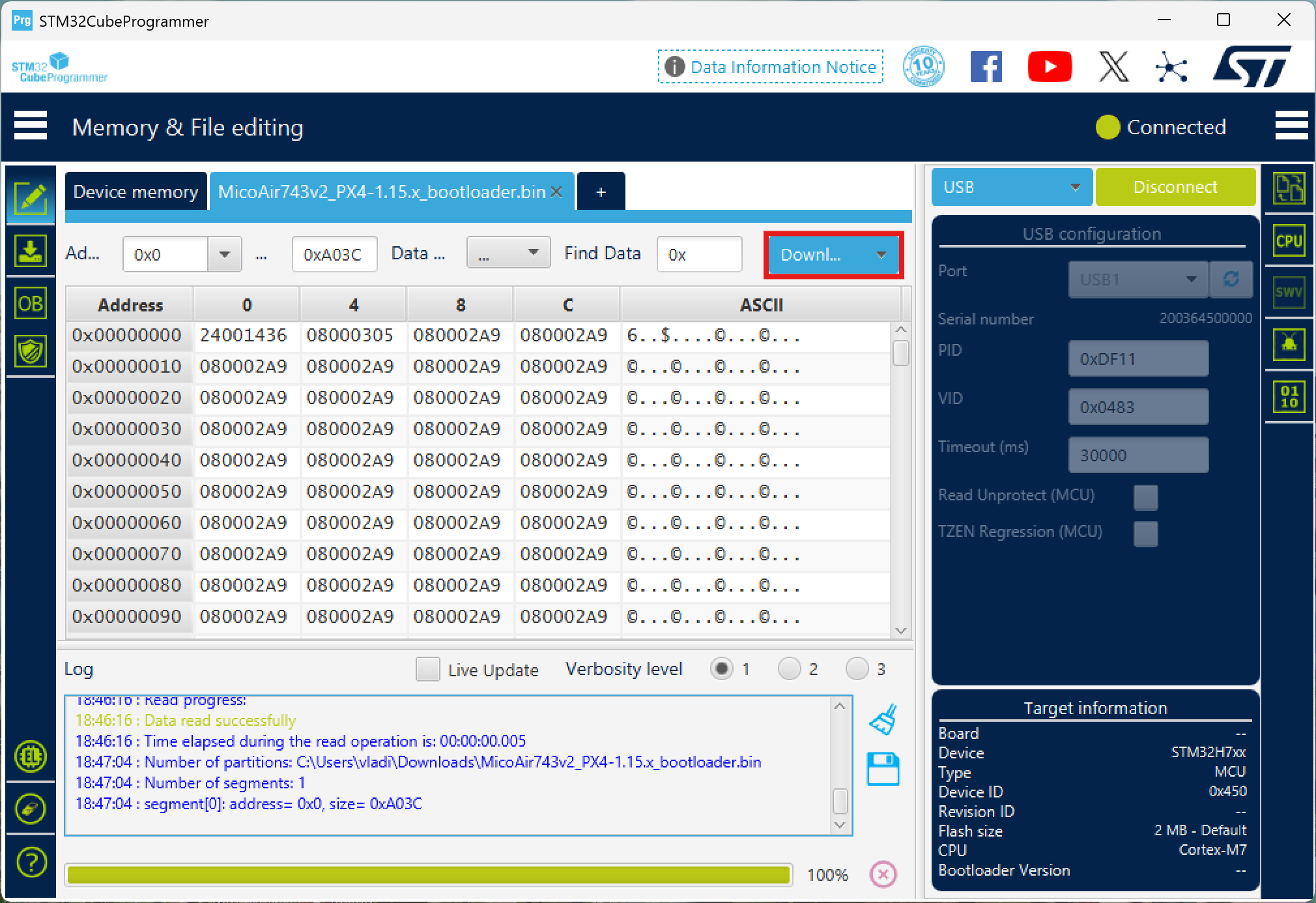 Click "Download" to flash the bootloader and wait until it finishes.