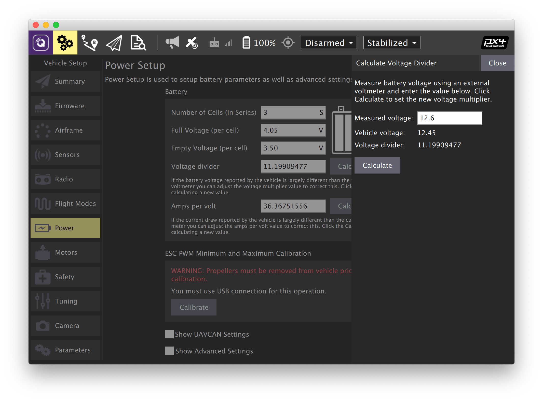 - In QGroundControl, go to the Vehicle Setup panel and select the Power menu.