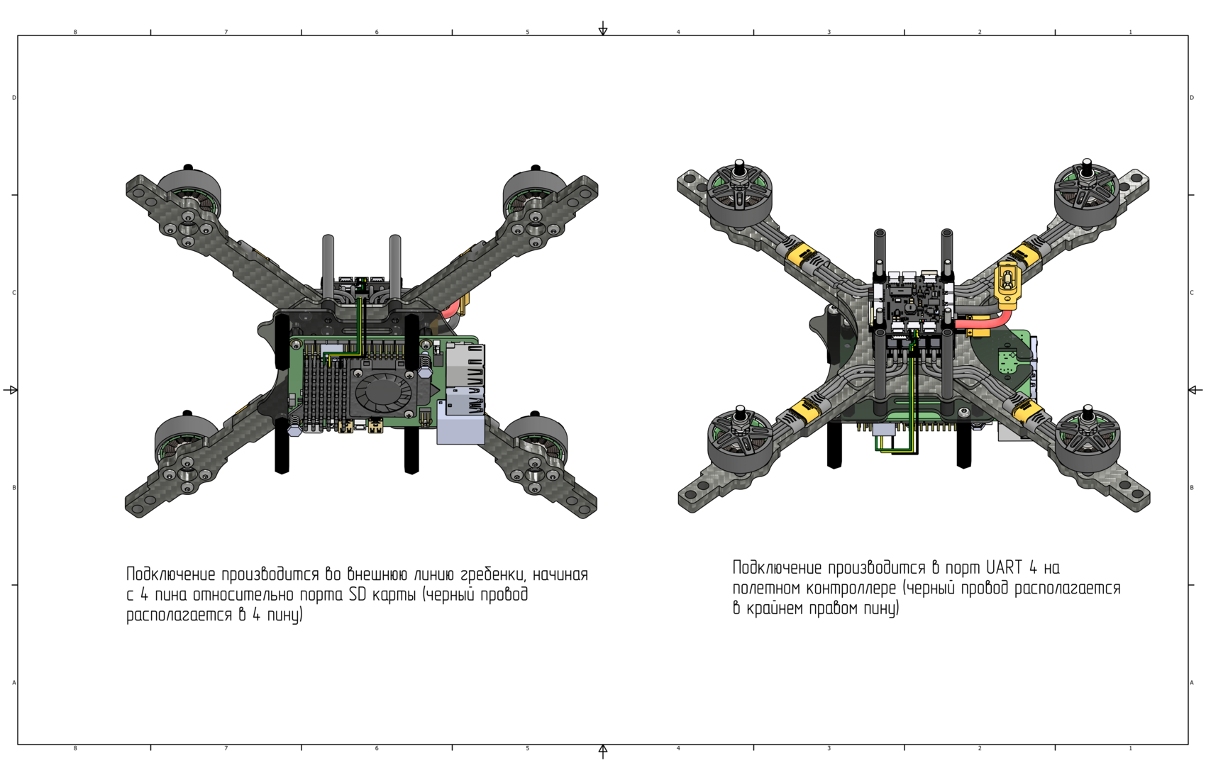 Подключите к Raspberry шлейф передачи данных. Подключение производится во внешнюю линию гребенки, начиная с 4 порта относительно порта SD карты(черный провод в 14 порту, см. pinout). Подключение ответной части производится в порт UART 4 на полетном контроллере(черный провод распологается в крайнем правом углу).