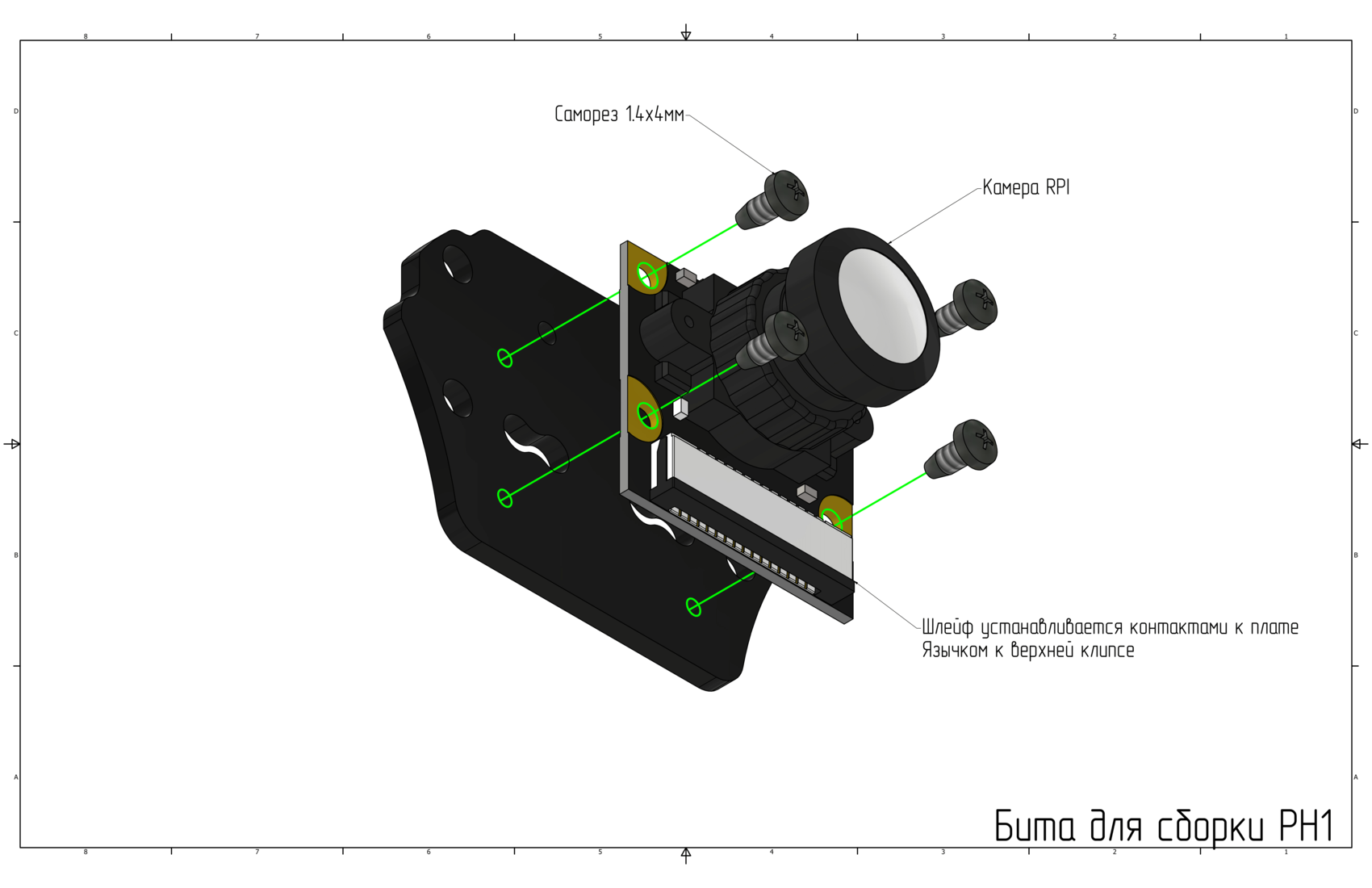 На малую монтажную деку установите камеру так, как показано на изображении ниже, после чего зафиксируйте ее с помощью 2х саморезов М1.4х4 (Ячейка 19), в верхнем левом и нижнем правом углах. Бита для сборки PH1.