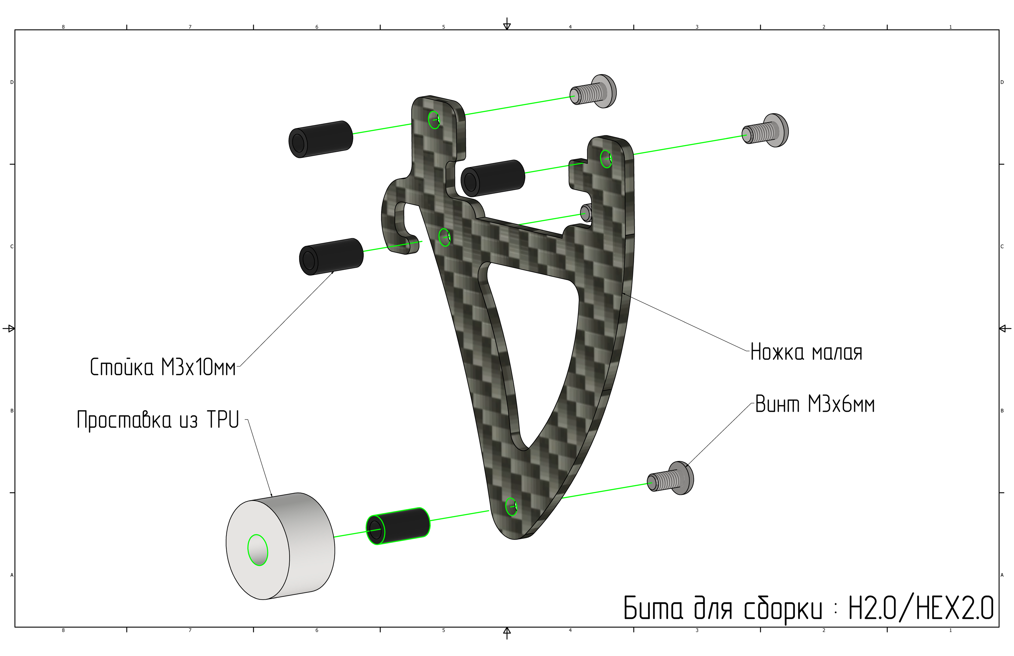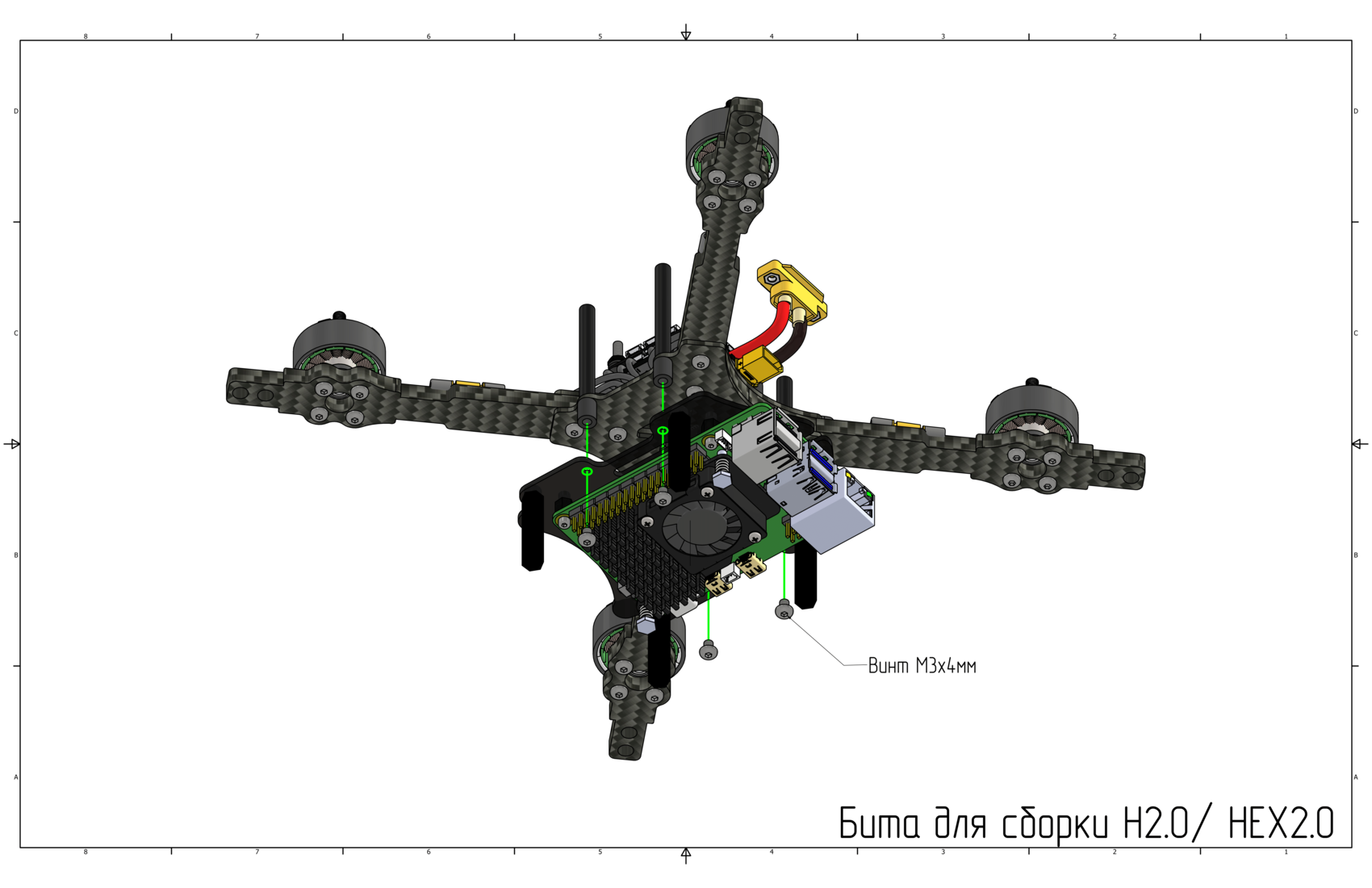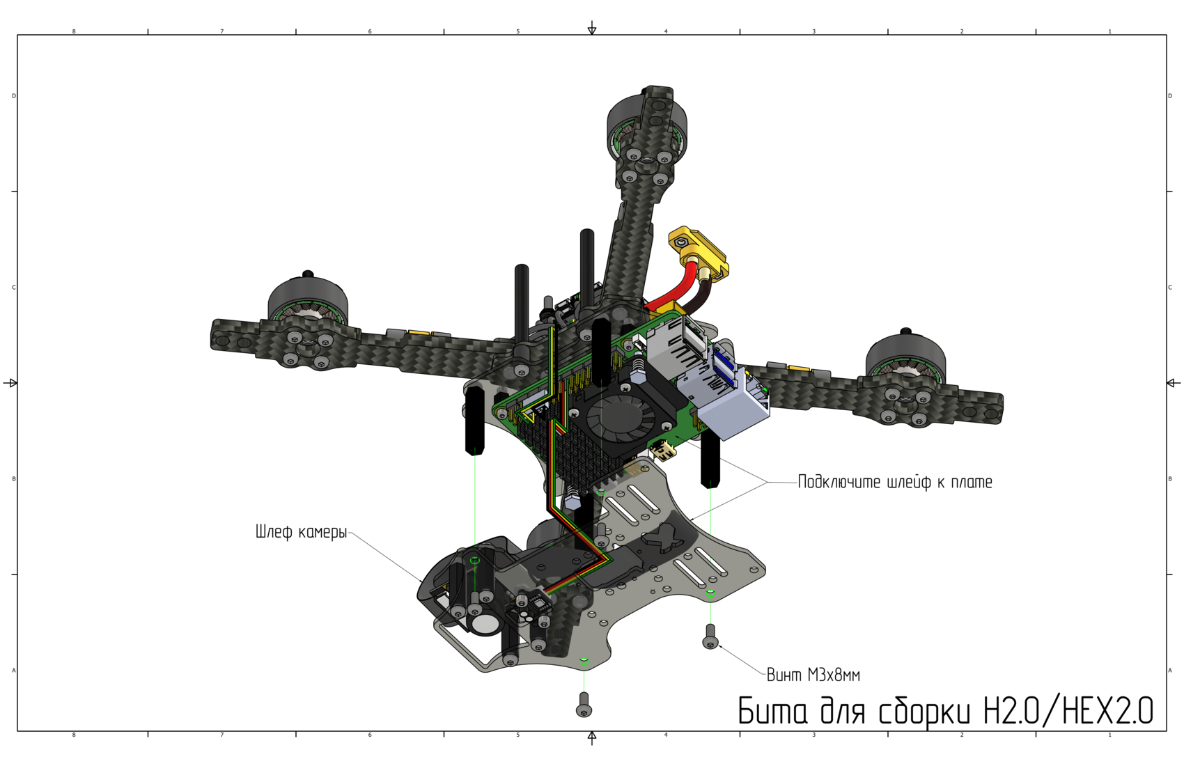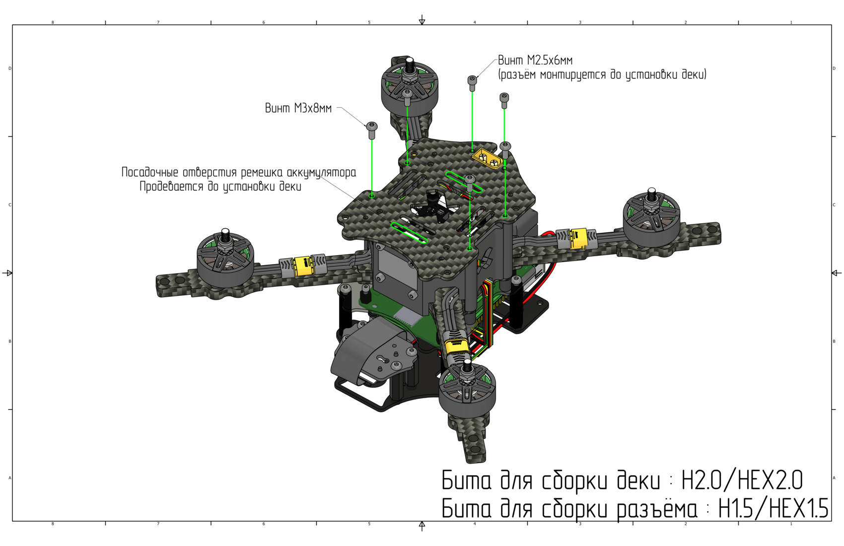 Проденьте ремешок в верхнюю деку, после чего закрепите ее на винты M3x8 (Ячейка 8) в алюминиевые стойки, закрепите разъем питания с помощью винтов M2.5x6 (Ячейка 18). Бита для сборки деки - H2.0/HEX2.0, для разъема - H1.5/HEX1.5.