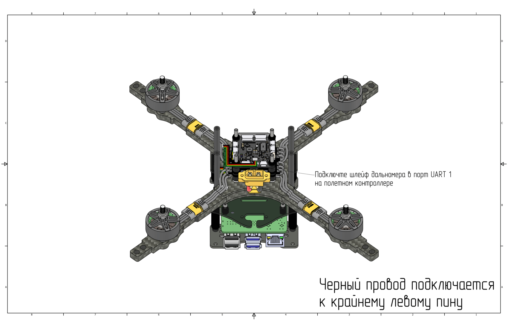 Подключите шлейф дальномера в порт UART 1 на полетном контроллере(черный провод в левом крайнем пину).
