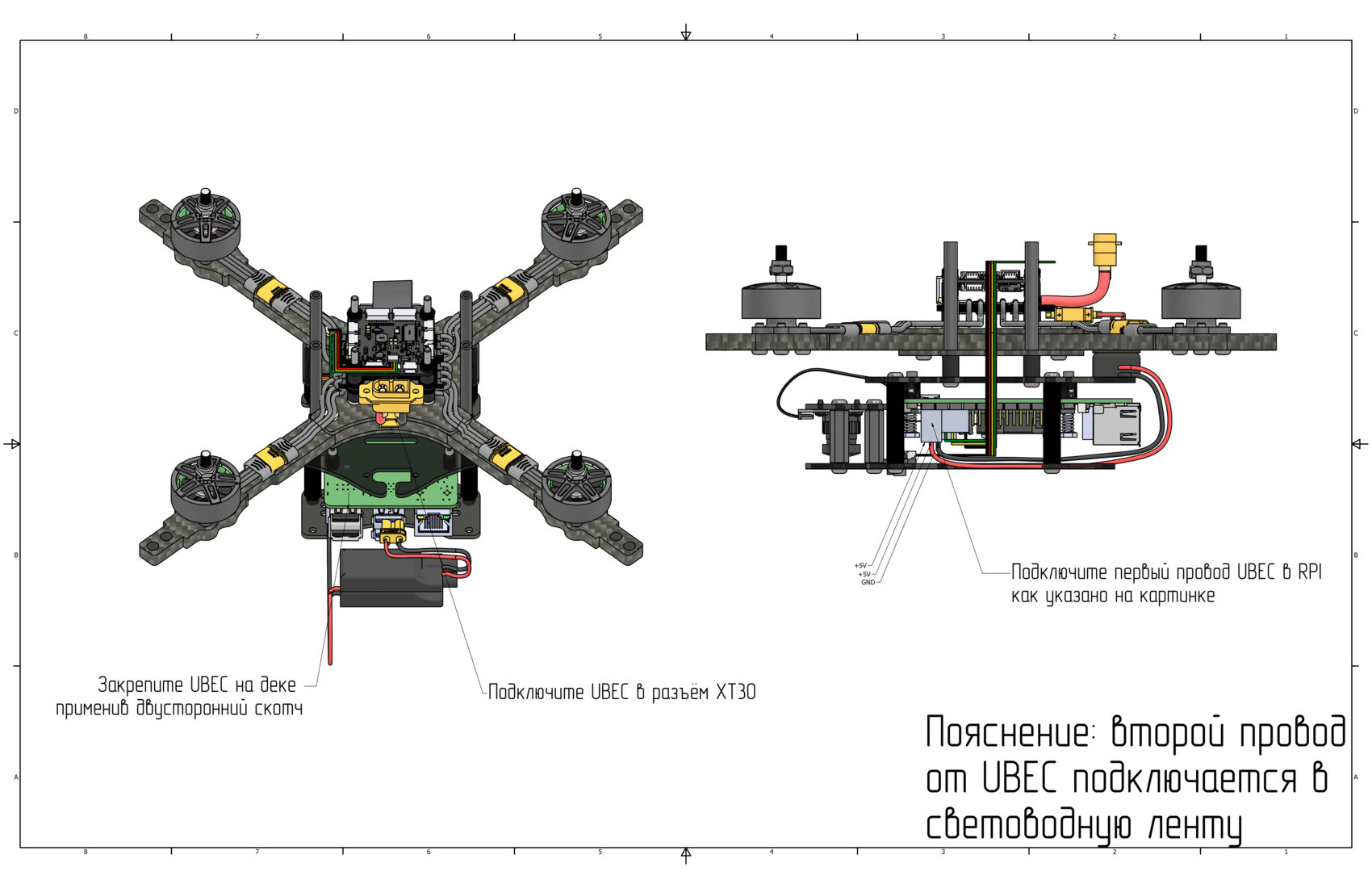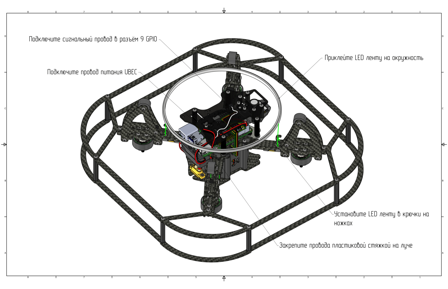 Наклейте LED ленту на окружность (Пластиковое кольцо для крепежа LED ленты) после чего установите в крючки на ножках и зафиксируйте провода пластиковым хомутом. Подключите питание во второй свободный UBEC, а сигнальный провод подключите в 9 GPIO (21 пин).