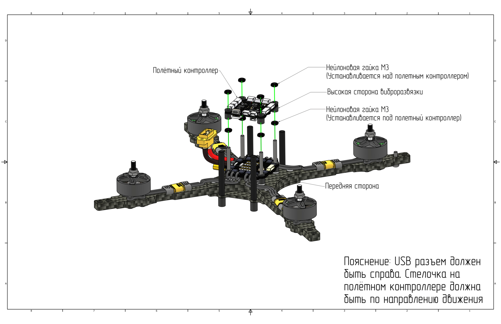 Перед установкой полетного контроллера, накрутите нейлоновые гайки M3 (Ячейка 2) на винты M3x40 (Ячейка 6), после чего установите полетный контроллер стрелкой вперед. Установите нейлоновые гайки для фиксации полетного контроллера.