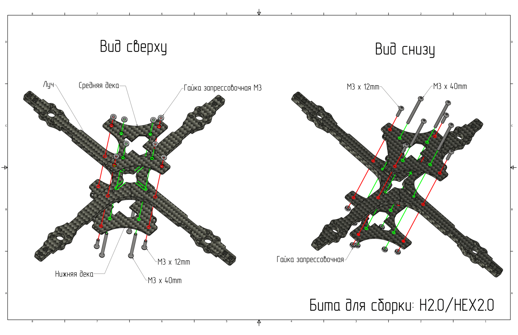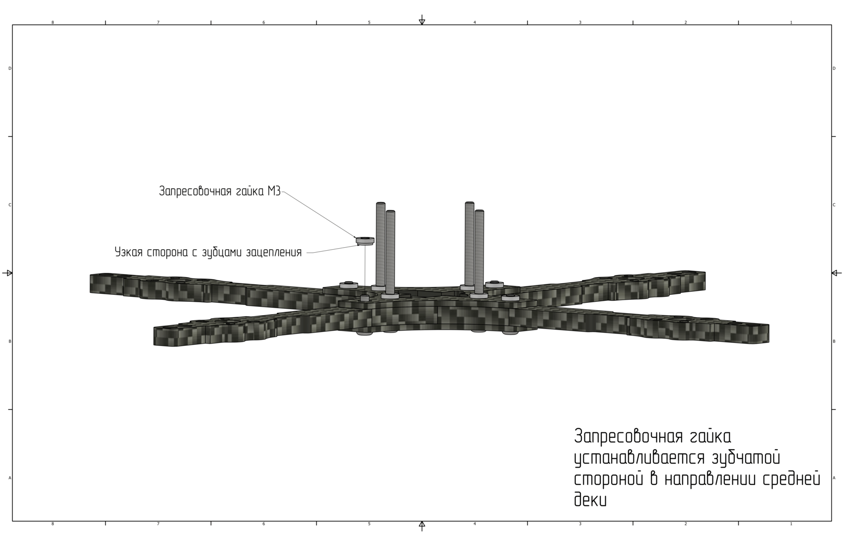 Установите винты M3x12 (Ячейка 7) и M3x40 (Ячейка 6) со стороны нижней деки, M3x12 (Ячейка 7) в крайние отверстия лучей, M3x40 (Ячейка 6) в центральные отверстия нижней деки.