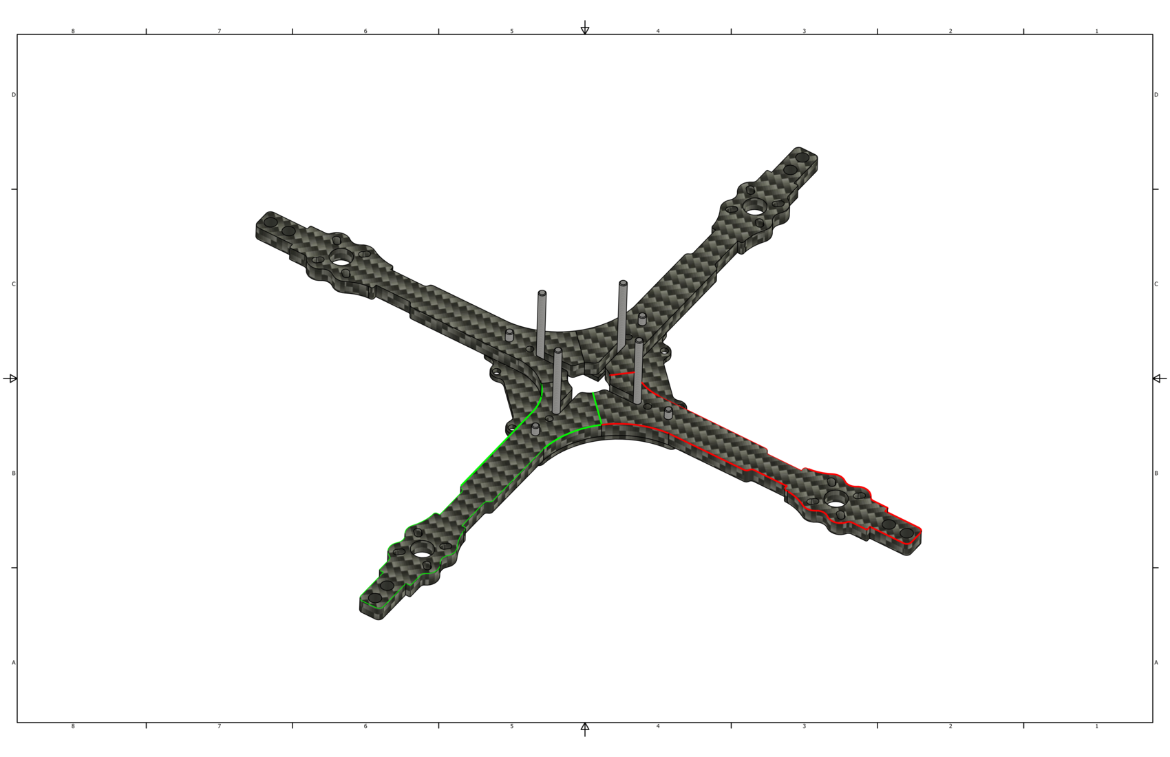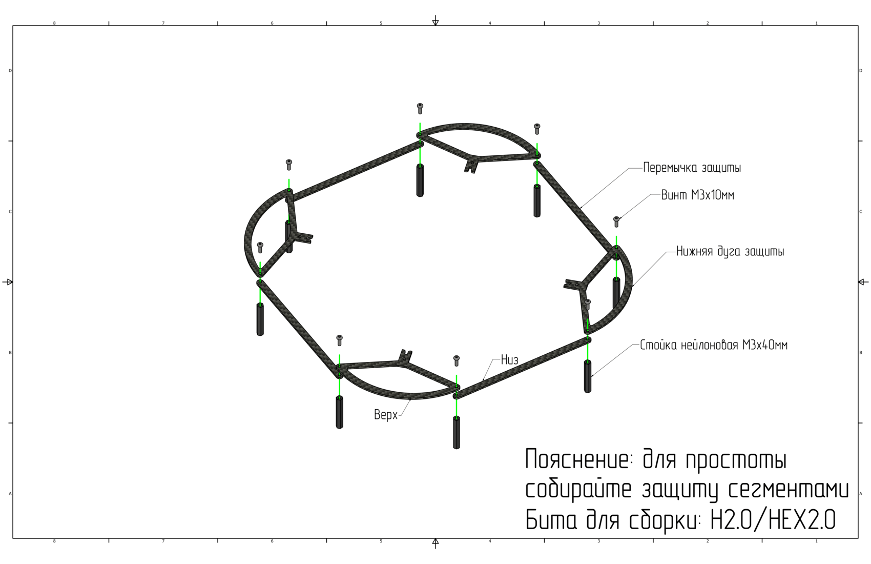 Расположите снизу в виде квадрата перемычки защиты, после чего на углы выложите нижние дуги защиты, зафиксируйте на винты M3x10 (Ячейка 13) сверху, снизу нейлоновые стойки 40мм (Ячейка 23).
