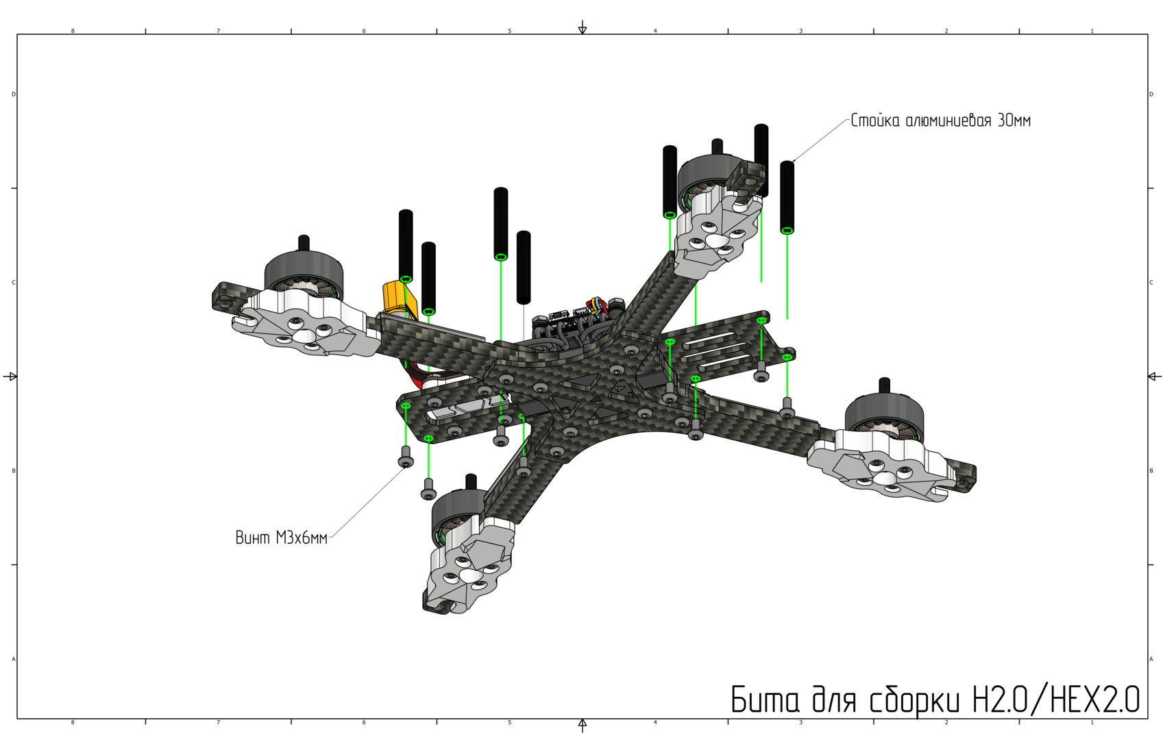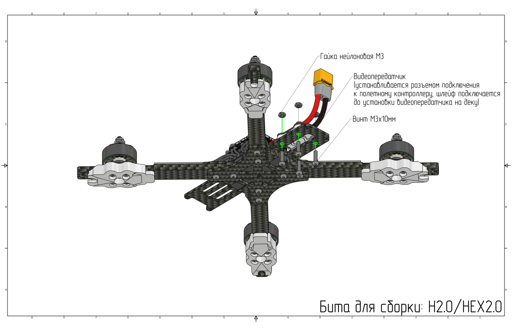 При сборке применяются крепёжные элементы разных типоразмеров. Установка винтов или стоек несоответствующего размера может привести к повреждению квадрокоптера.