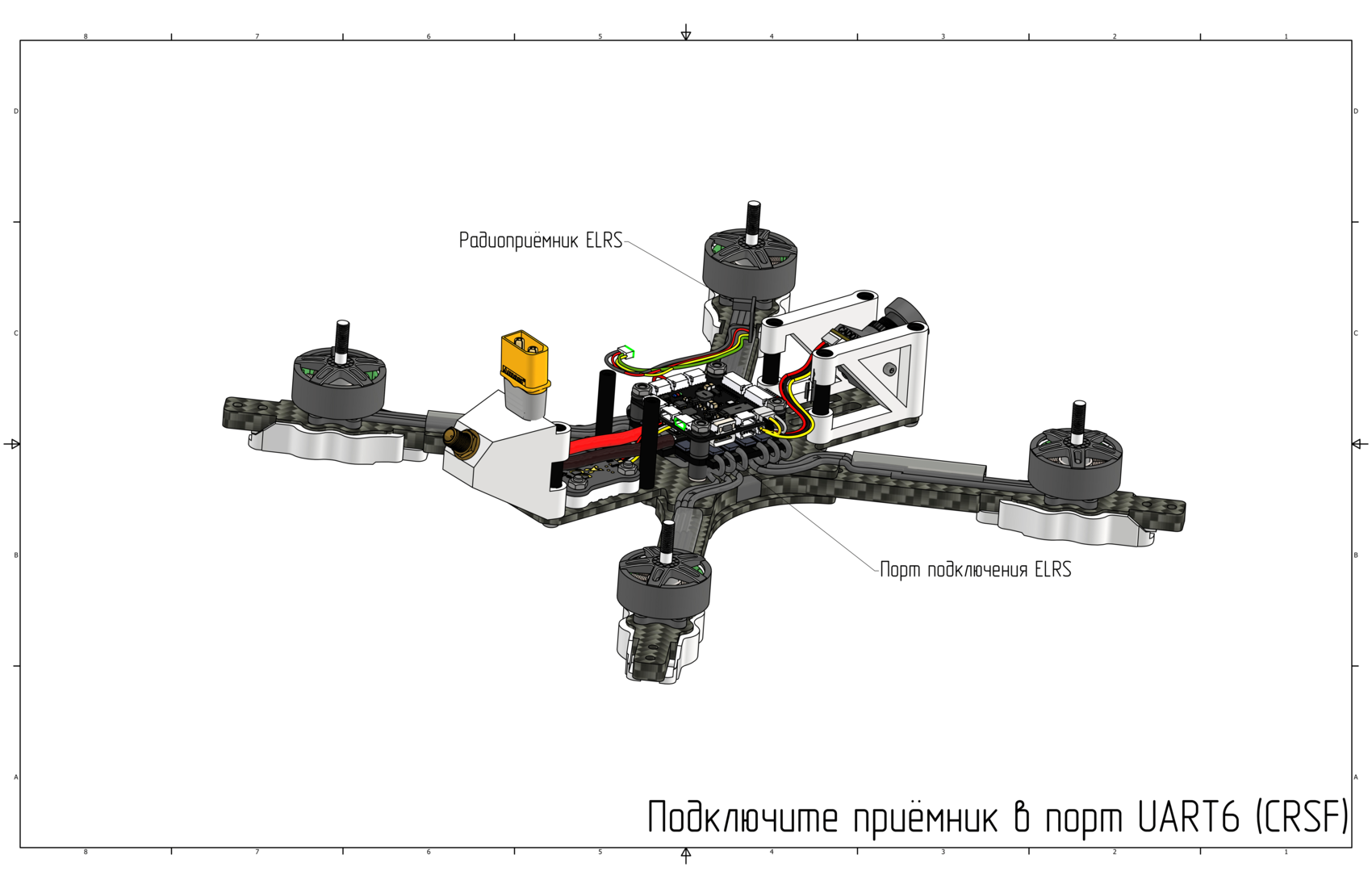 Установите радиоприемник ELRS и подключите при помощи шлейфа в порт SBUS/CRSF на полётном контроллере.