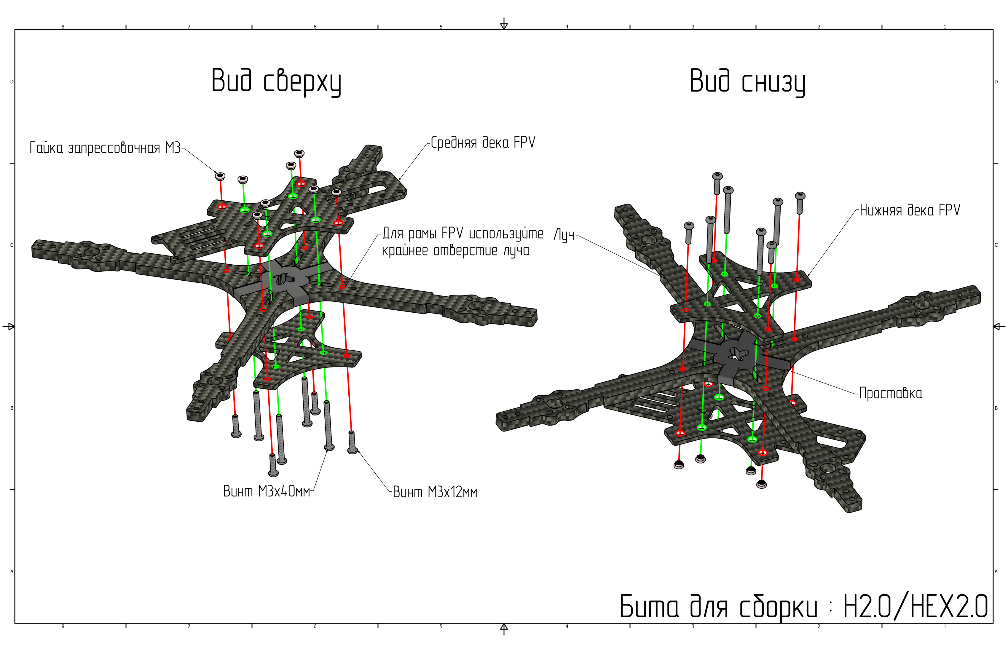 Установите винты M3x12 (Ячейка 7) и M3x40 (Ячейка 6) со стороны нижней деки, M3x12 (Ячейка 7) в крайние отверстия лучей, M3x40 (Ячейка 6) в центральные отверстия нижней деки.