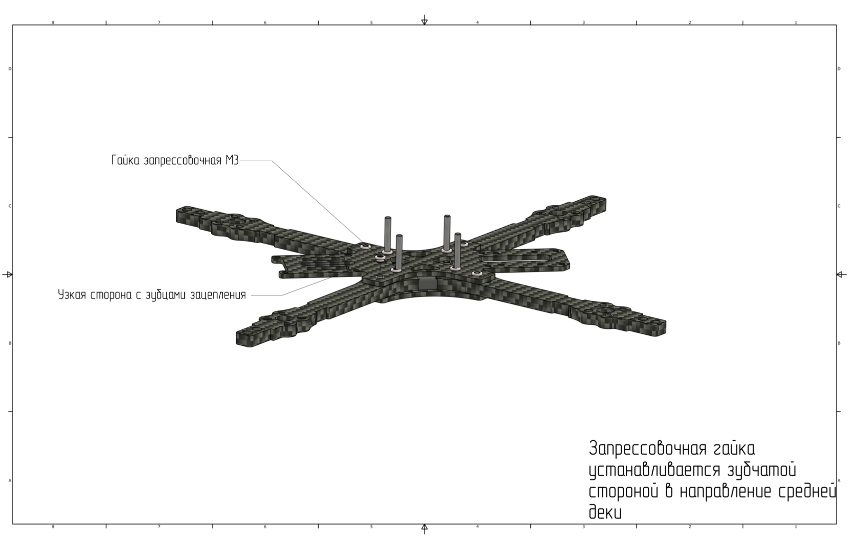 На средней деке установите запрессовочные гайки М3 (Ячейка 1) и зафиксируйте их винтами.