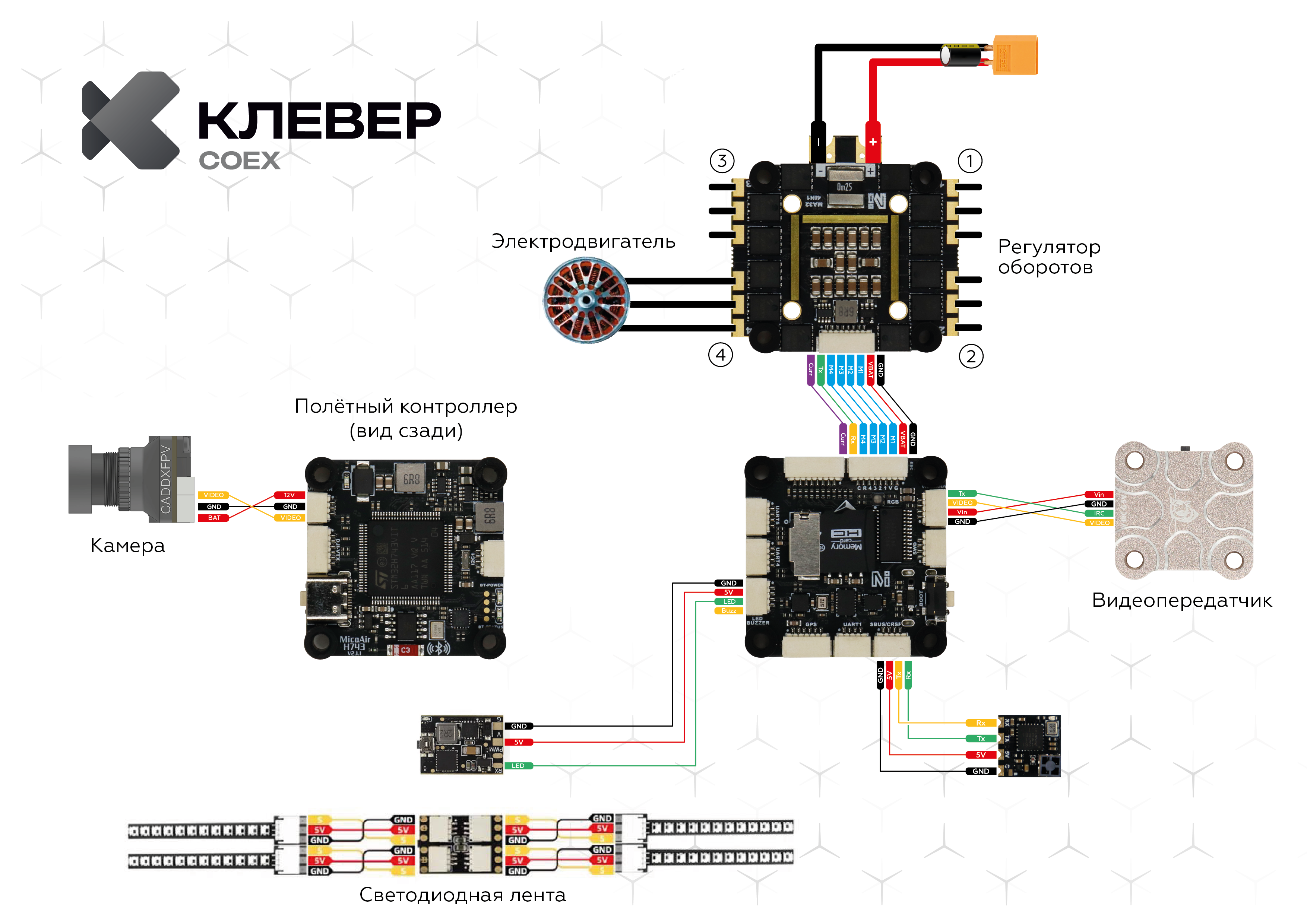 Подключите LED модули в хаб, как показано на изображении. Подключите хаб в разъём LED/Buzzer на полётном контроллере.