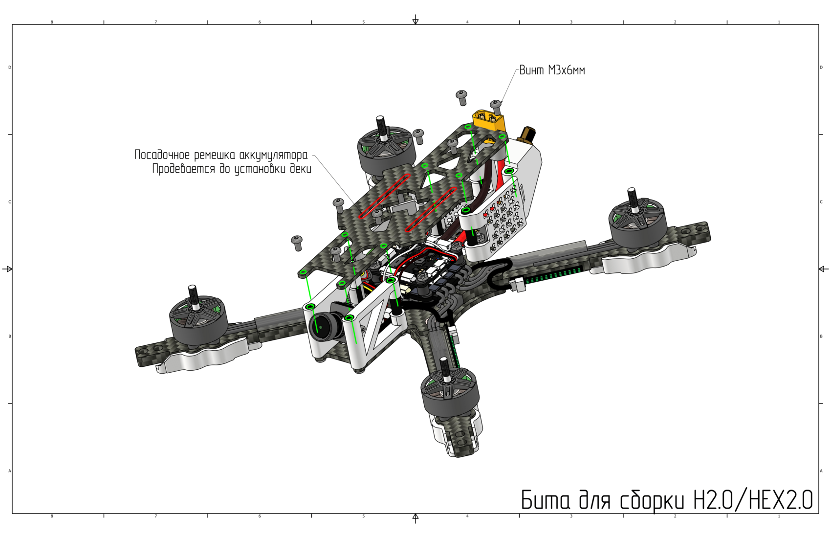 Протяните стропу для аккумулятора в посадочные пазы, установите верхнюю деку используя винты М3х6 (Ячейка 9).
