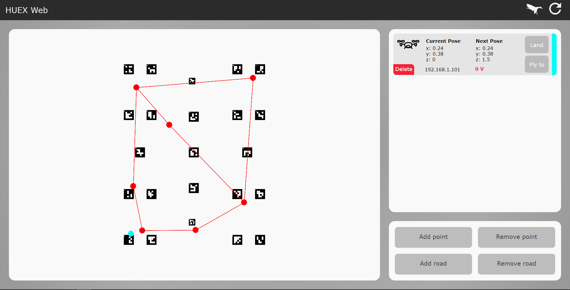 В данном веб интерфейсе можно следить за полётами всех дронов на карте (масштабировать с помощью колёсика, передвигать с помощью Alt). При нажатии на лебедя в правом верхнем углу все коптеры аварийно садятся, А при нажатии на значок "обновить" все коптеры автоматически удаляются, что приводит к удалению всех команд и посадке активных на текущий момент коптеров.